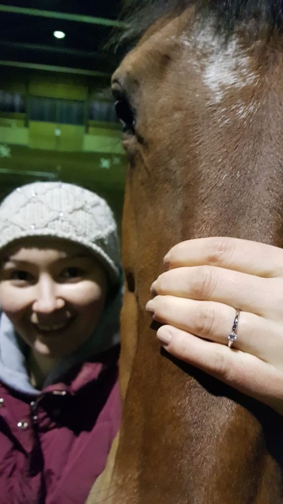 Als wir dann im Stall waren, war es schon relativ spät und da niemand mehr im Stall war, haben wir beschlossen Kendy und Rocky in der Halle ein paar Runden spielen zu lassen. Während Kendy und Rocky miteinander tobten und ich sie dabei beobachtete, meinte Markus plötzlich: "Das wäre dann wohl der richtige Augenblick." Ich drehte mich um und antwortete: "Augenblick für was?" ... und dann passierte es. Wie im Film kniete Markus hin, holte einen Ring aus der Hosentasche und fragte, ob ich ihn heiraten wollte. Völlig von den Socken und peinlich berührt (immerhin war ich nur im Schlabberlook mit zerzausten Haaren im Stall) antwortete ich natürlich mit einem JA.